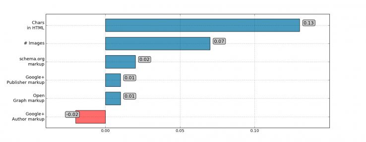 實驗同時測試了額外的一些頁面優化數據的相關性,例如結構性標注(schema.org),結果發現相關性趨于0,因此推測這些因素暫時還沒有作為排名因素。包括:Html字符數、圖片、schema標注、Google+的發布者標注、Open的圖表標注、Google+的作者標注。